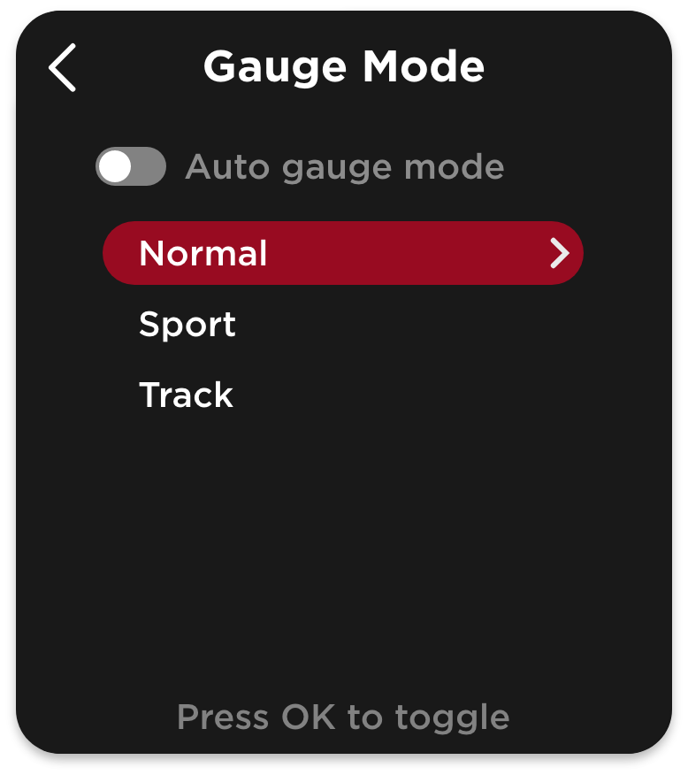 Normal, Sport, and Track gauge displays to match your mood. Or set it to change automatically for the full OEM+ experience.